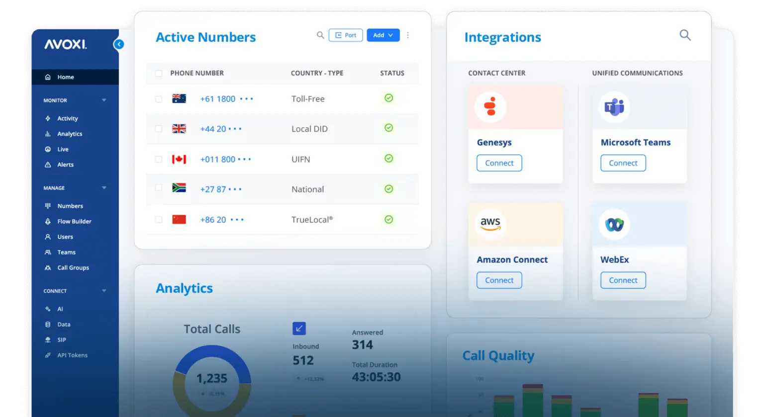 AVOXI’s cloud communications platform enables instant number provisioning, service metric monitoring, call routing updates, and more from within its virtual walls. Here are some additional benefits you can expect: